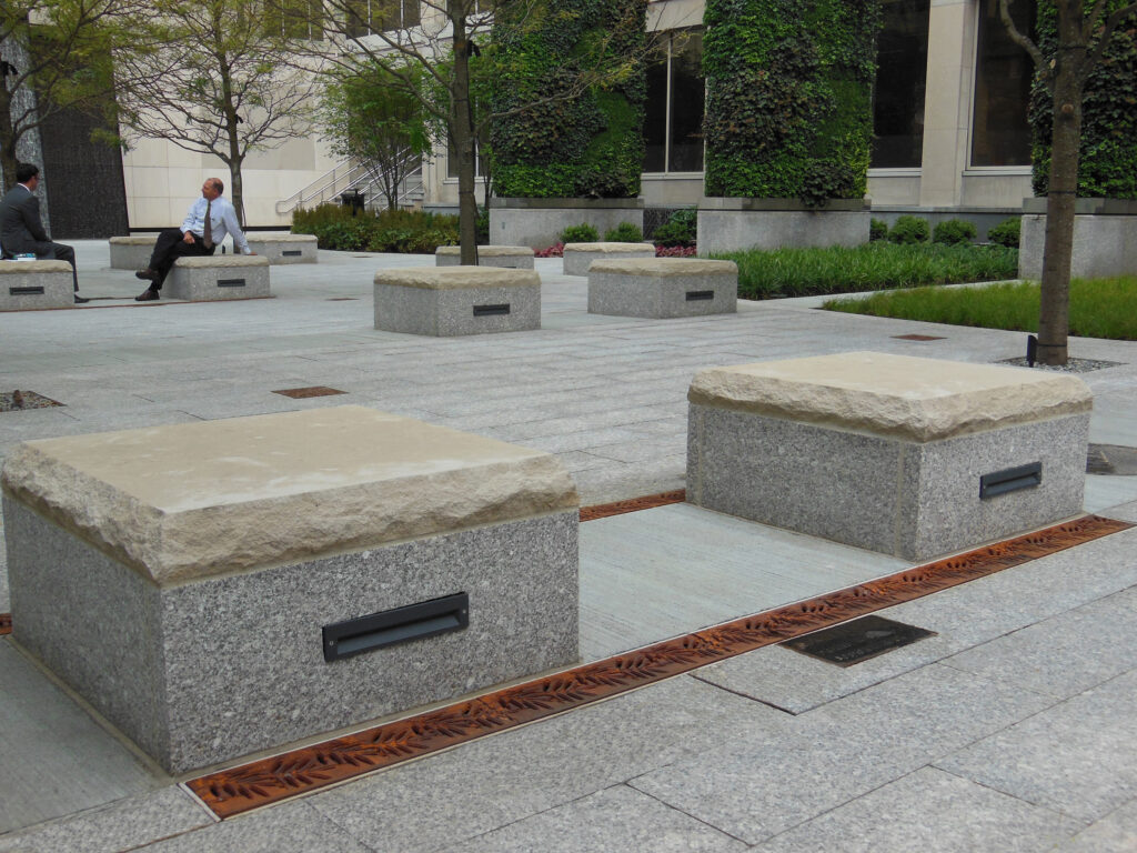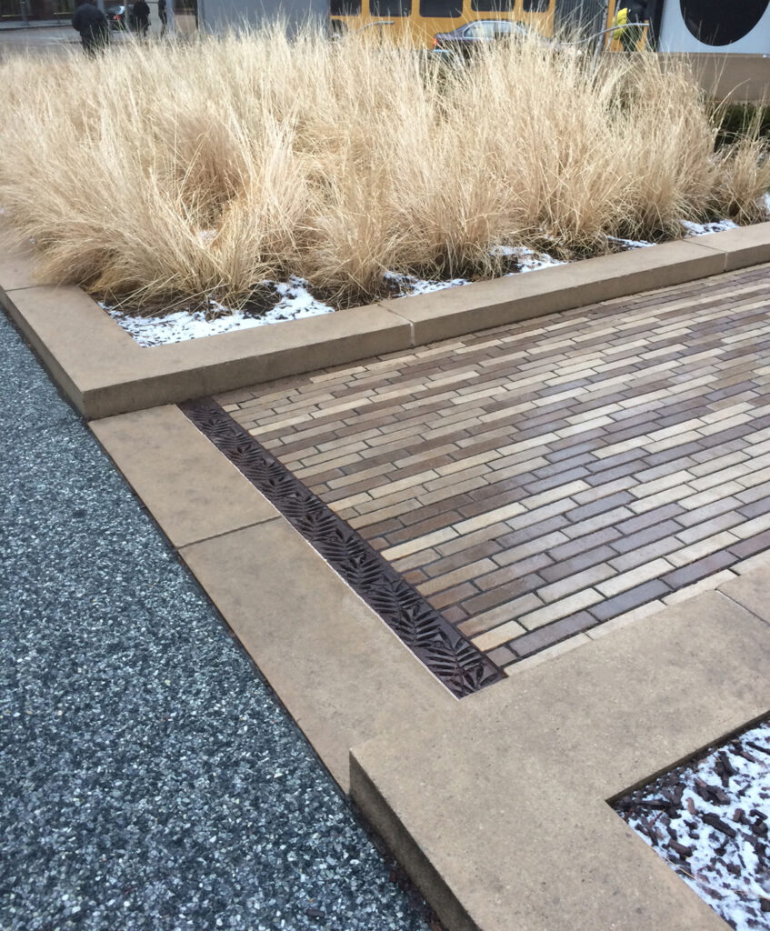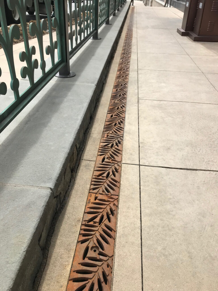Locust 6″ x 24″ trench grate, raw cast iron. DESIGN: Copley Wolff Design Group. PROJECT: Liberty Mutual Streetscape and Linear Park. LOCATION: Boston, MA.