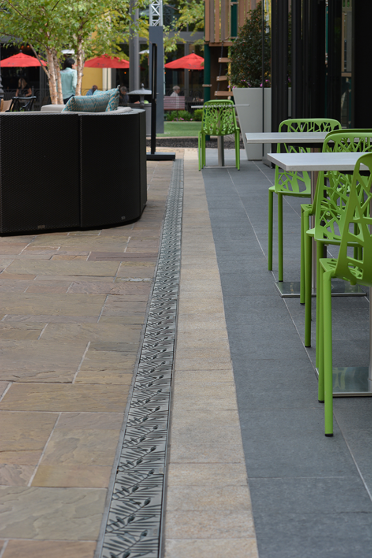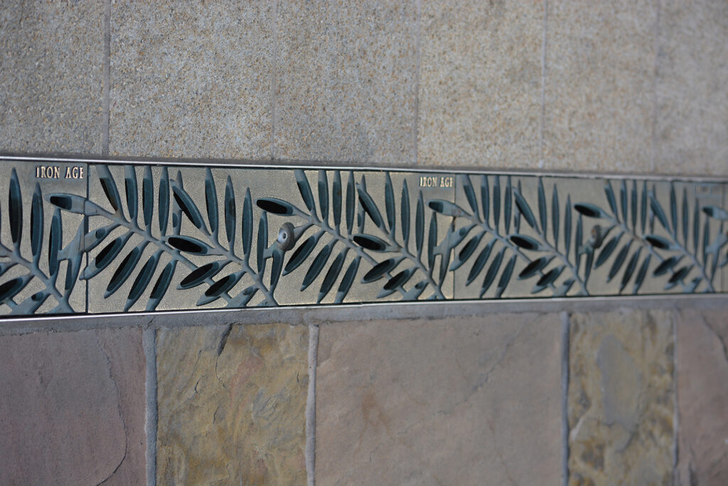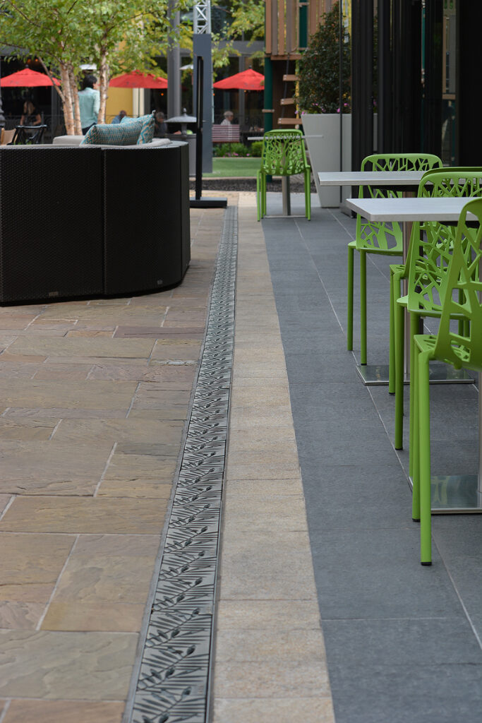 Locust 5″ x 20″ trench grate, raw cast bronze. DESIGN: The Land Group. PROJECT: The Village at Meridian. LOCATION: Meridian, ID.