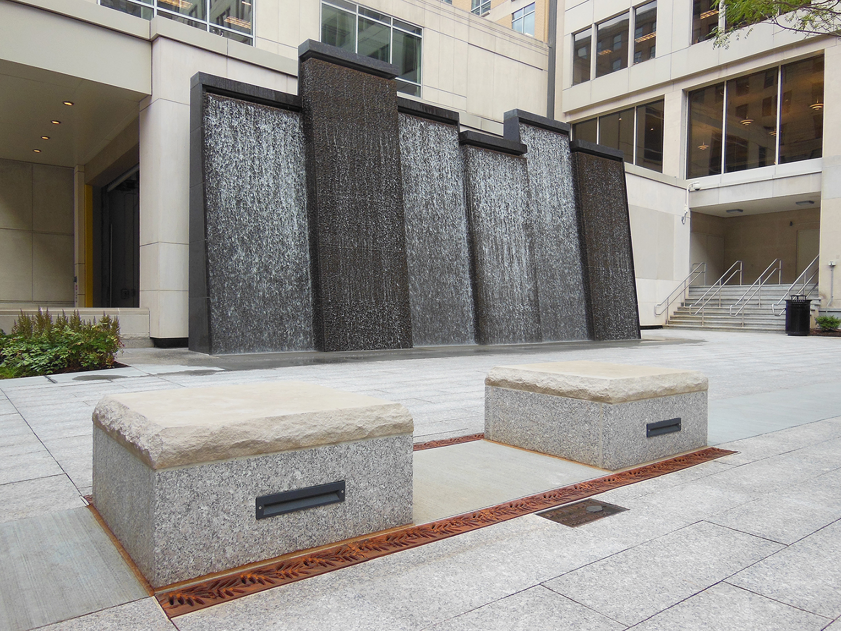 Locust 6″ x 24″ heel-proof trench grates, cast ductile iron with baked-on-oil finish. DESIGN: Los Angeles Department of Transportation. PROJECT: Lankershim Plaza. LOCATION: Los Angeles, CA.