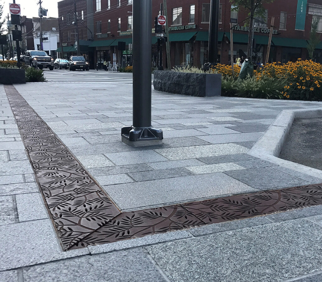 Locust 9″ x 20″ heel-proof trench grate, cast iron with baked-on-oil finish. DESIGN: Arterial. CONTRACTOR: Flanagan’s Contracting Group. PROJECT: Millburn Streetscape. LOCATION: Millburn, NJ.