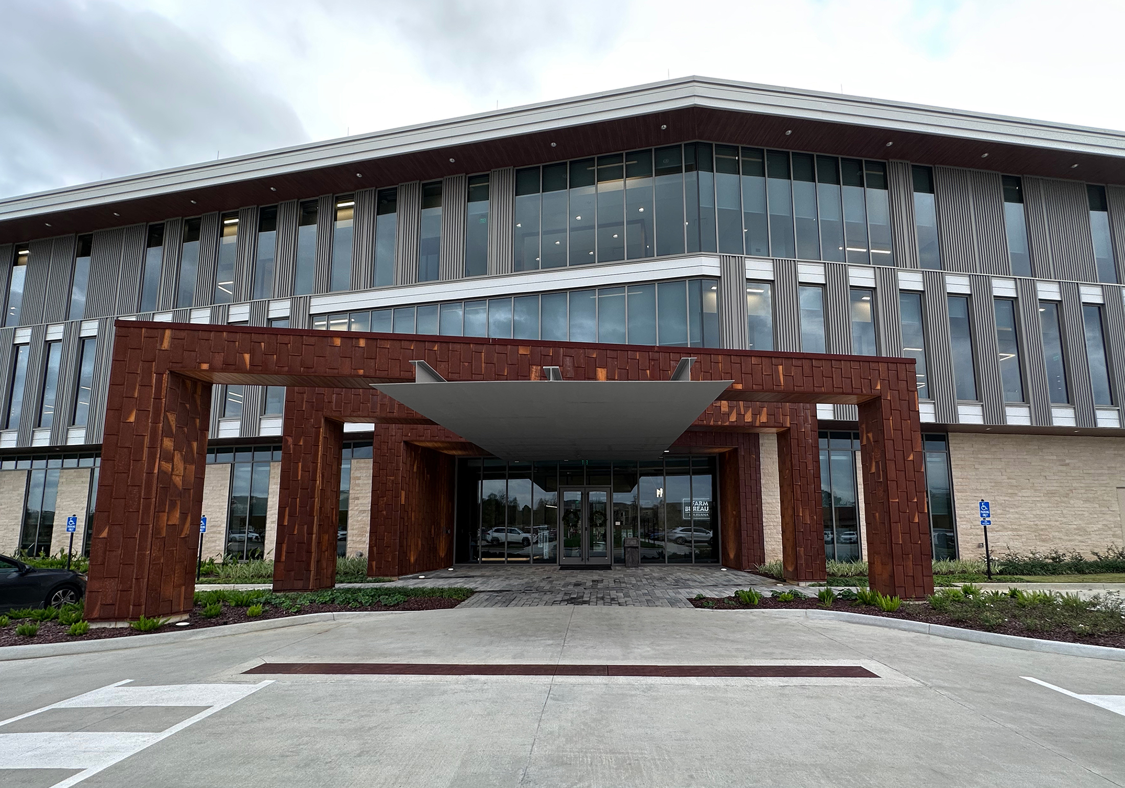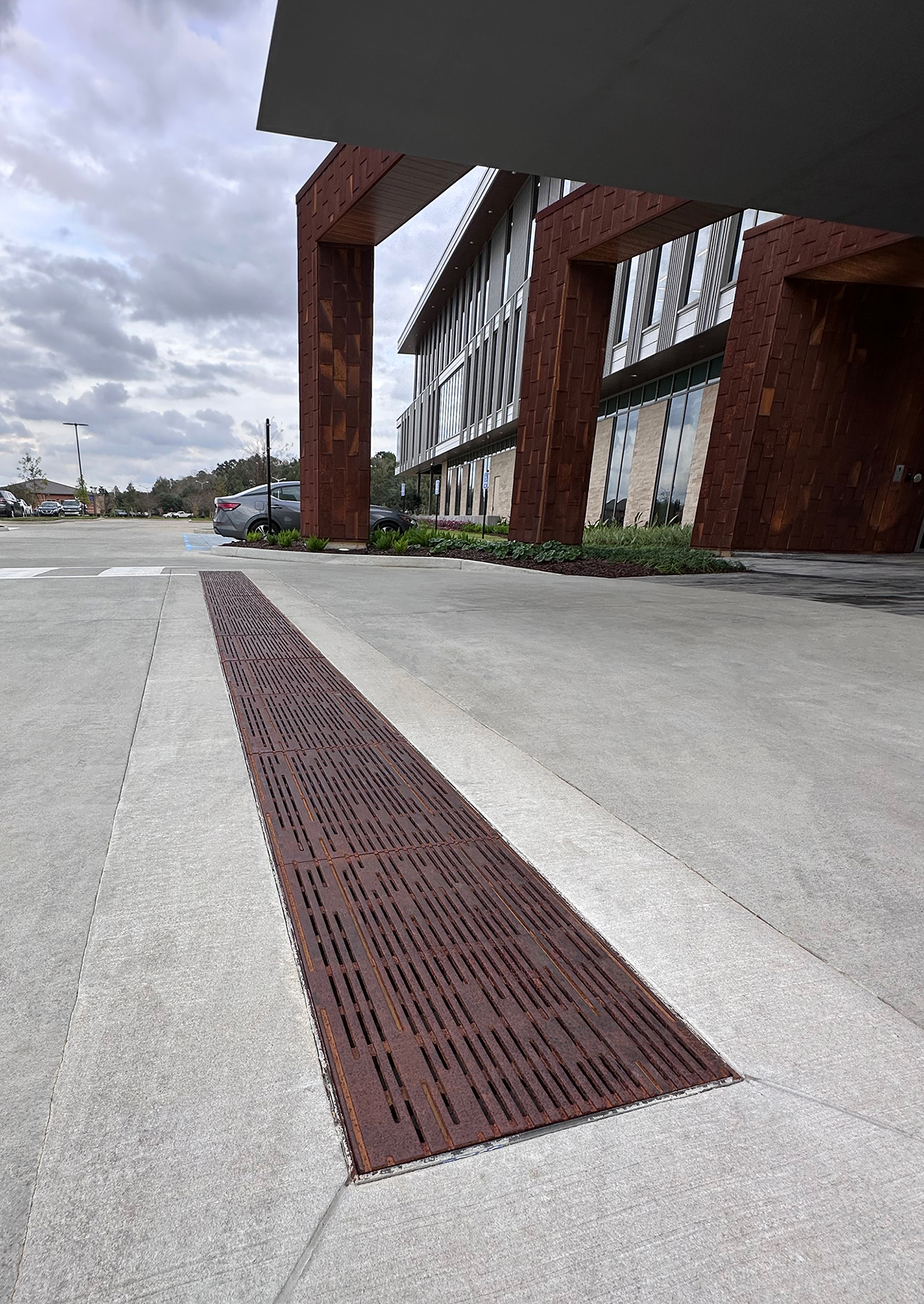 Rain 18″ x 24″ heel-proof trench grates, raw cast ductile iron. DESIGN: McKnight Landscape Architects. INSTALLER: Arkel Constructors. PROJECT: Louisiana Farm Bureau. LOCATION: Baton Rouge, LA.