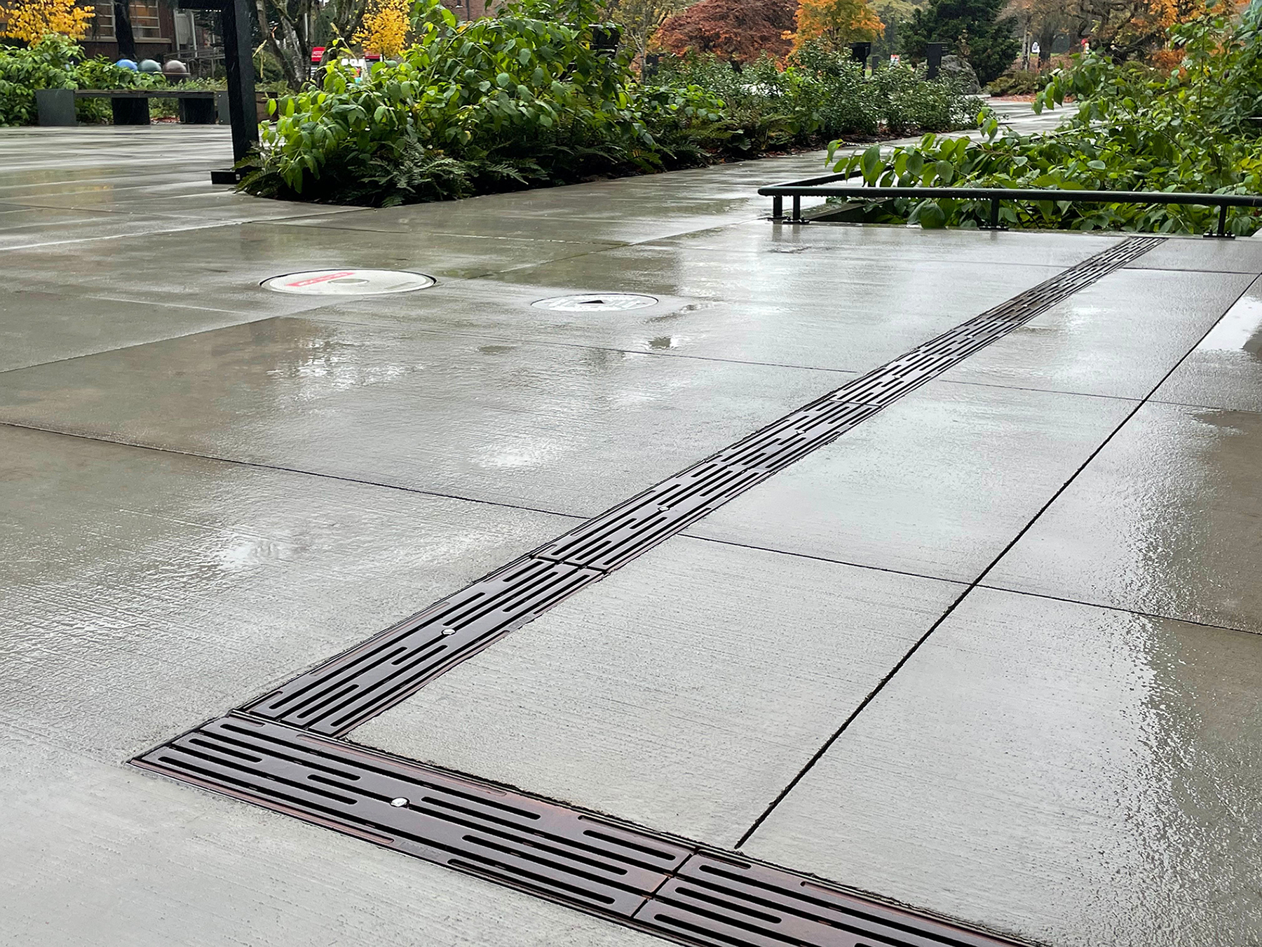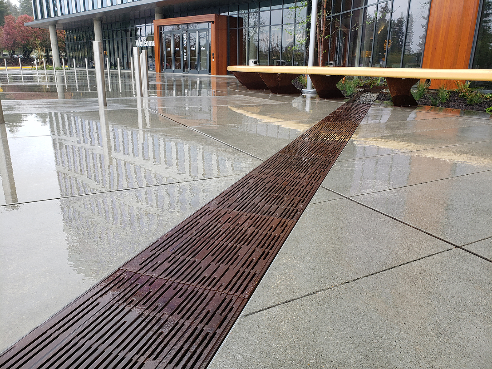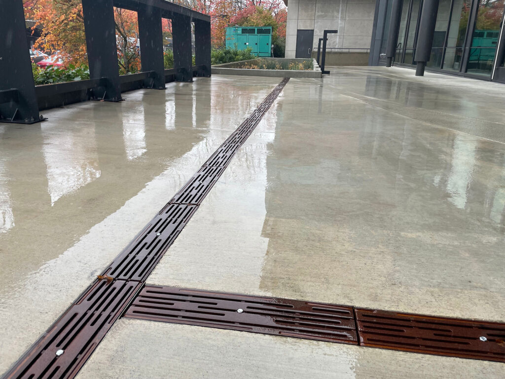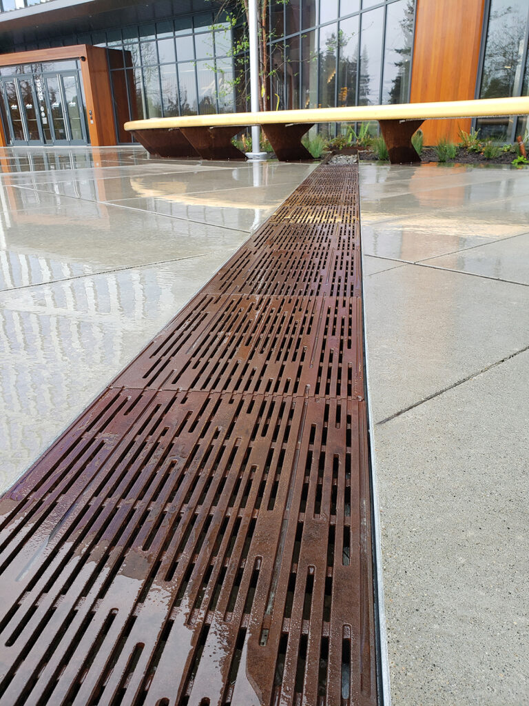 Rain 5″ x 20″ heel-proof trench grates, raw cast iron. DESIGN: Mithun. PROJECT: Seattle University Sinegal Center for Science and Innovation. LOCATION: Seattle, WA.