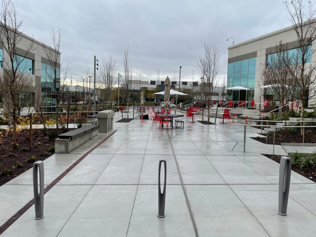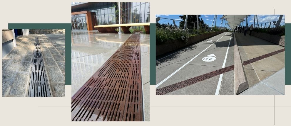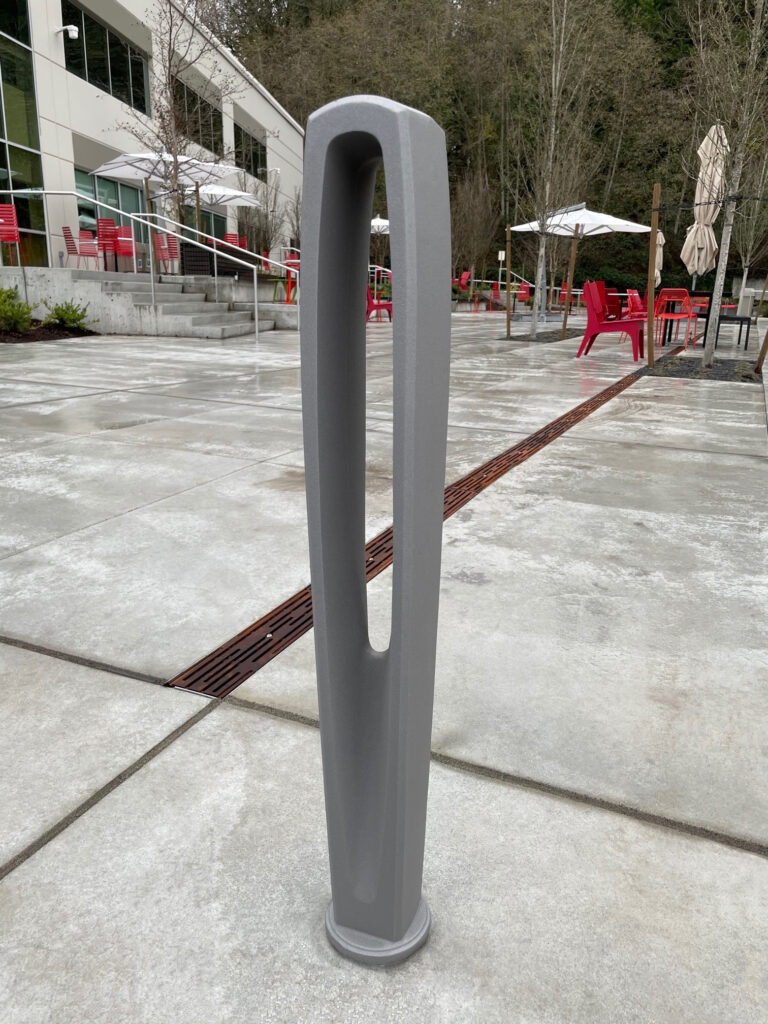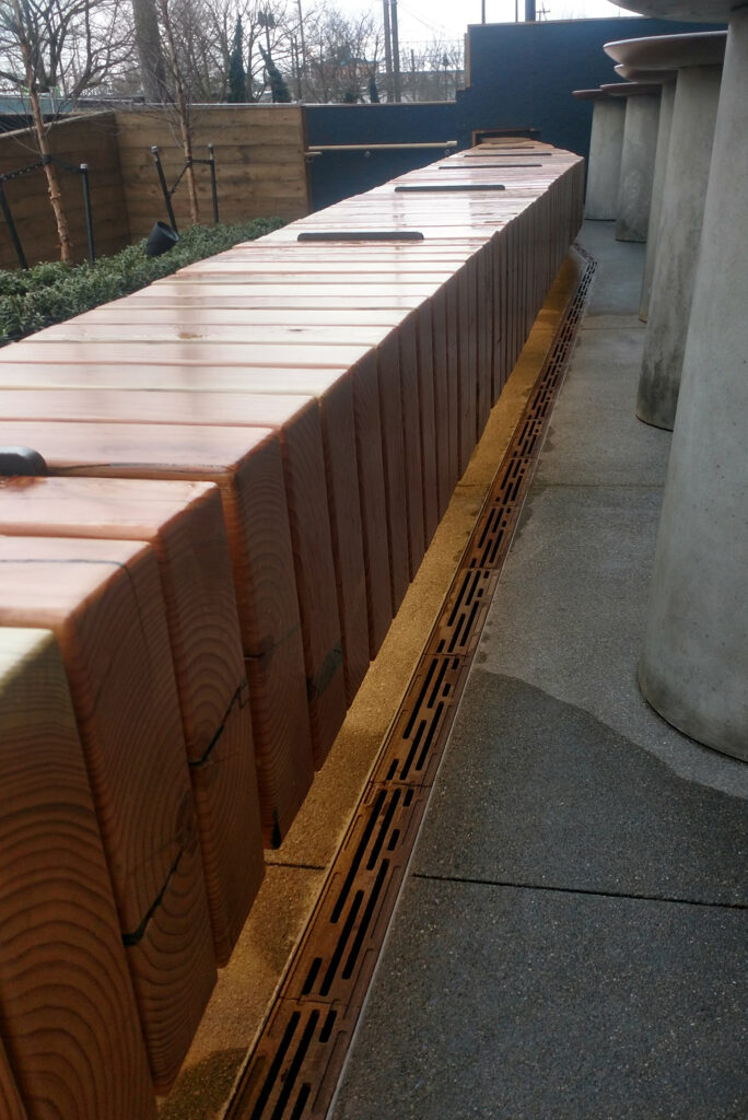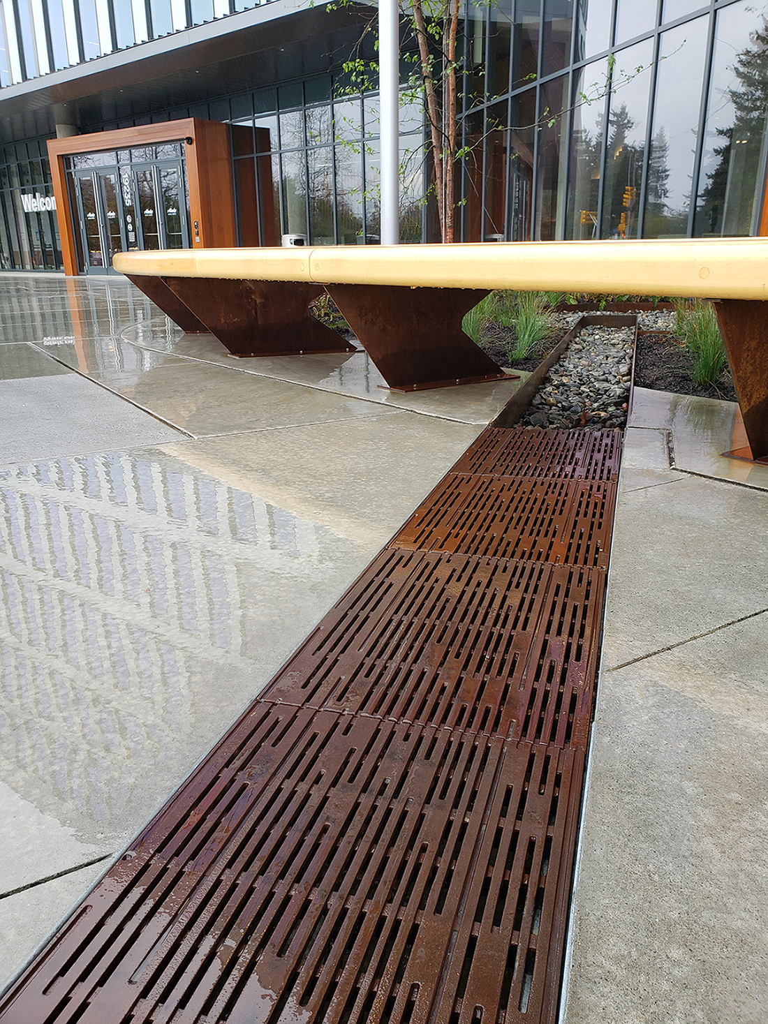 Rain 5″ x 20″ heel-proof trench grates, cast iron with baked-on oil finish. (Our Needle Bollard with removable “mousetrap” design in forefront of the picture.) DESIGN: Swift Company. INSTALLER: Lease Crutcher Lewis. PROJECT: Seagen Inc. LOCATION: Bothell, WA.