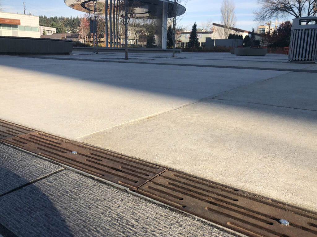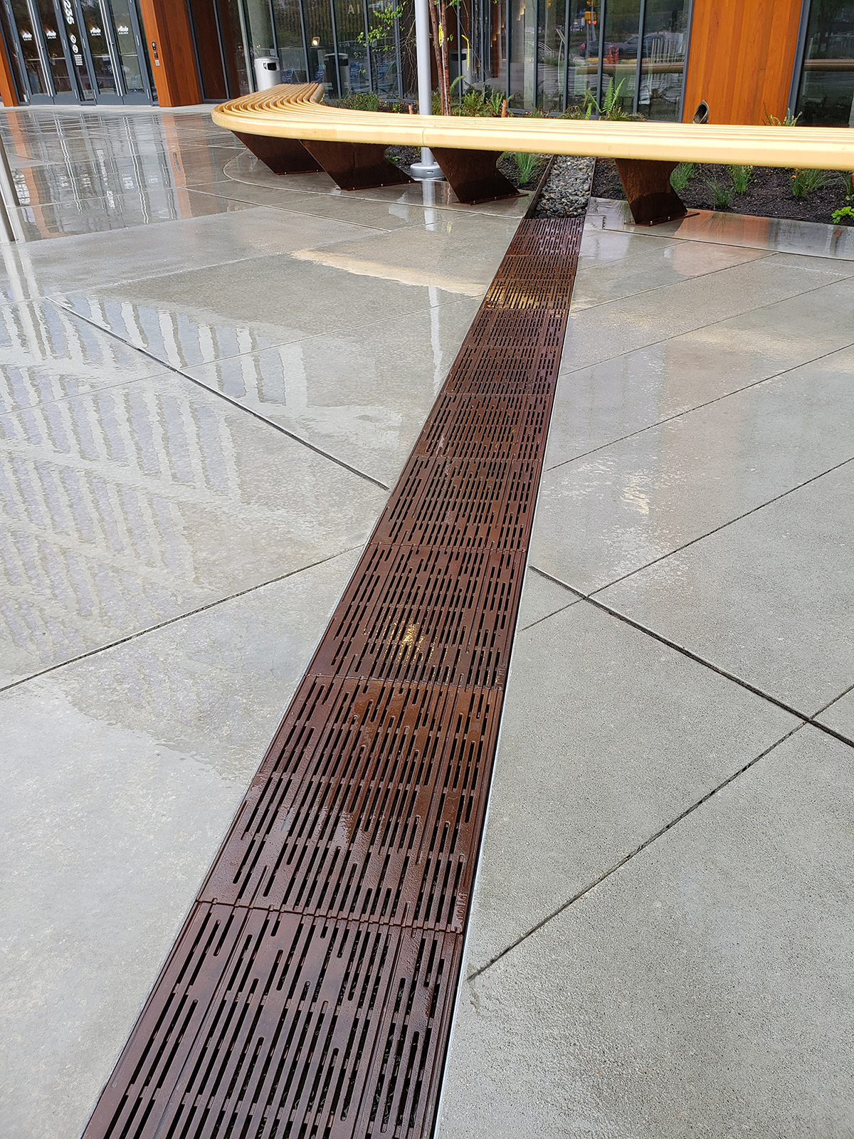 Rain 5″ x 20″ heel-proof trench grate, cast ductile iron with baked-on-oil finish. DESIGN: PFS Studio PROJECT: Redmond Downtown Park LOCATION: Redmond, WA.
