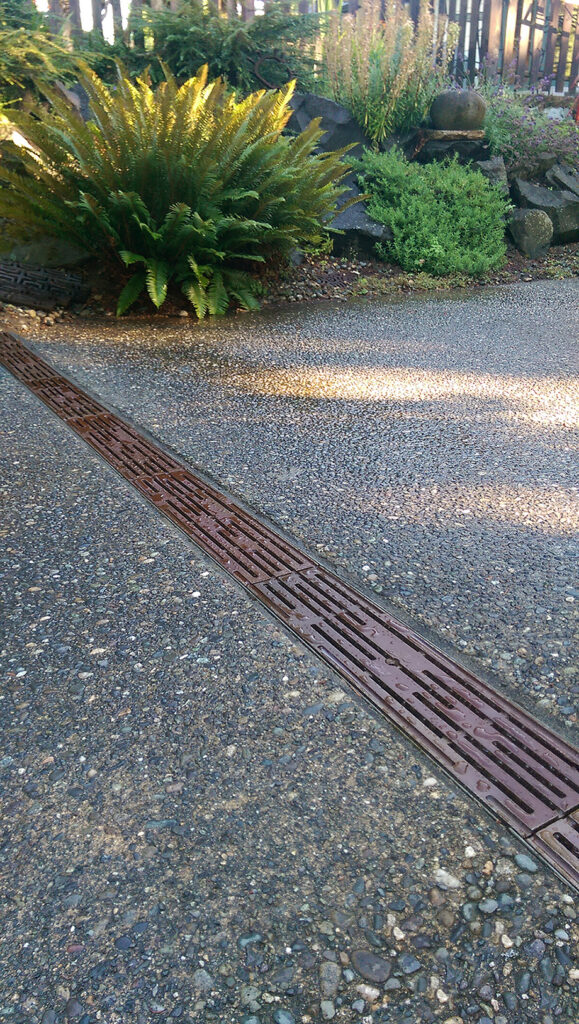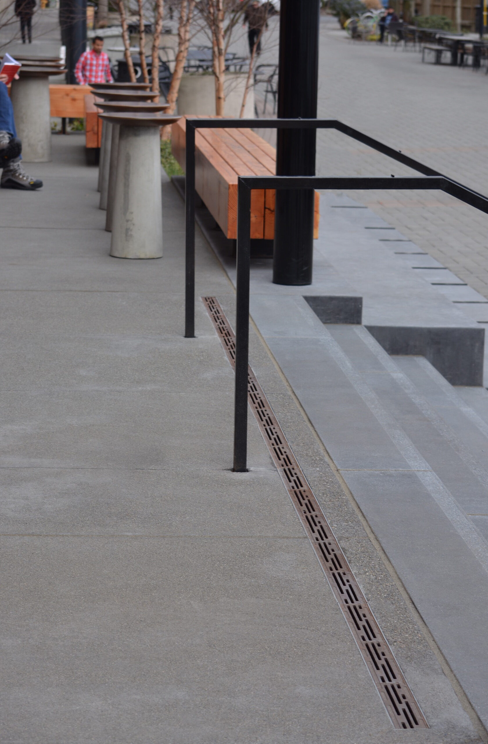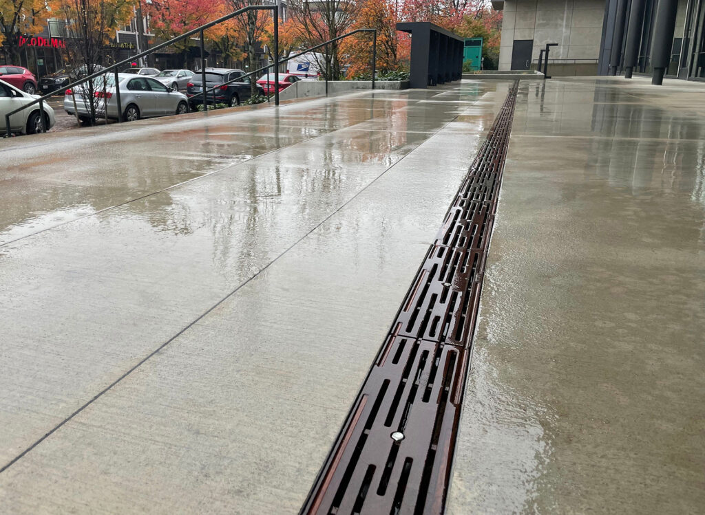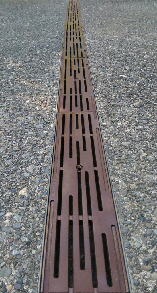 Rain 5″ x 20″ heel-proof trench grate, cast ductile iron with baked-on-oil finish. LOCATION: Seattle, WA.