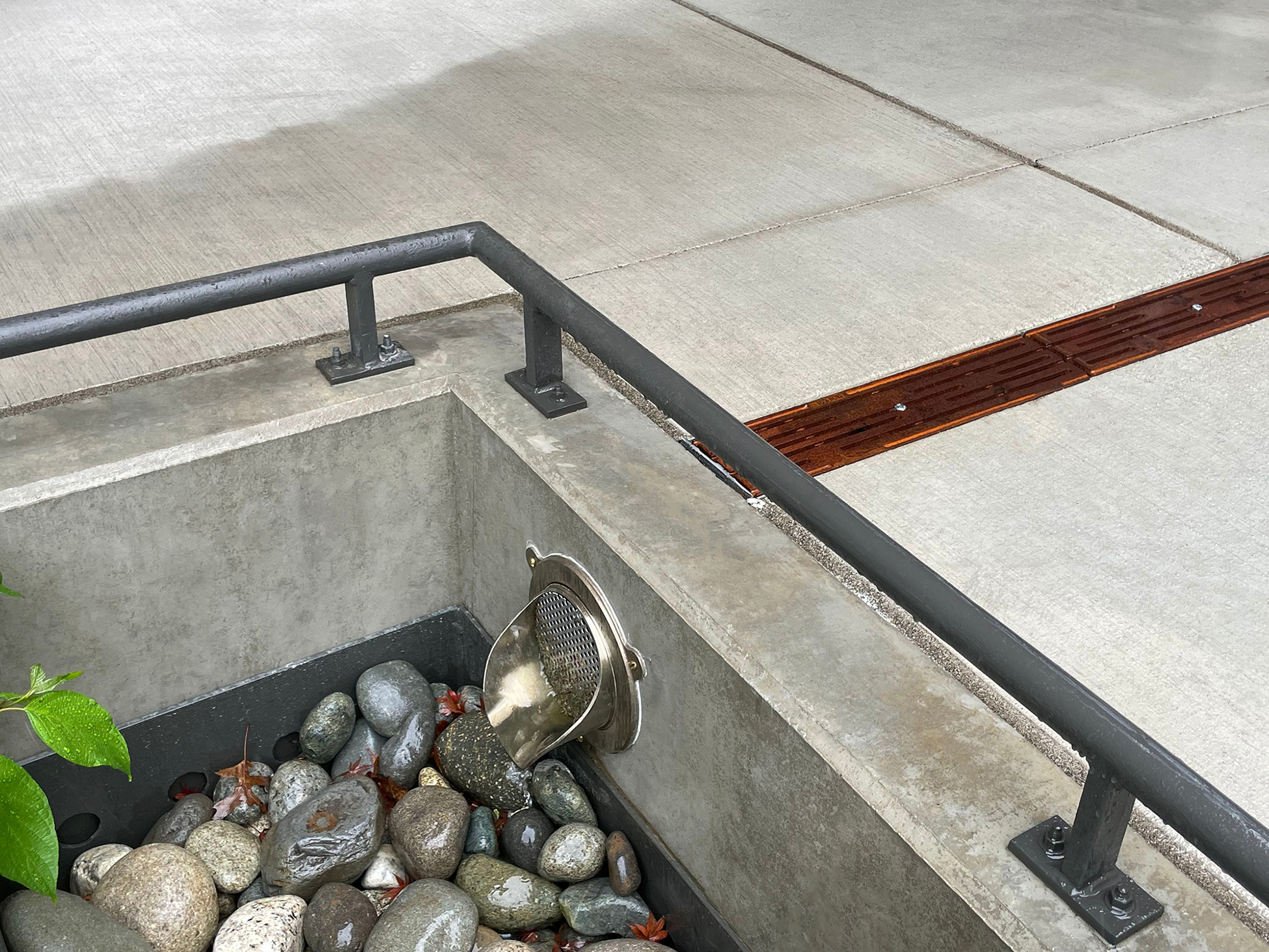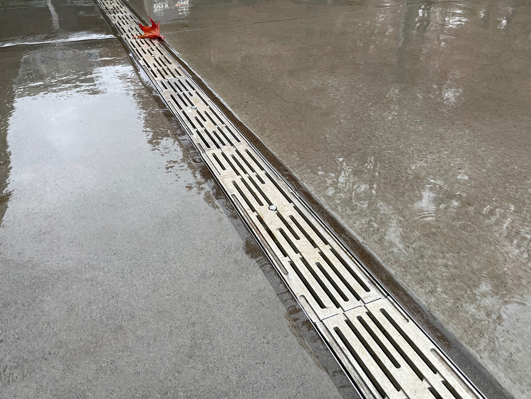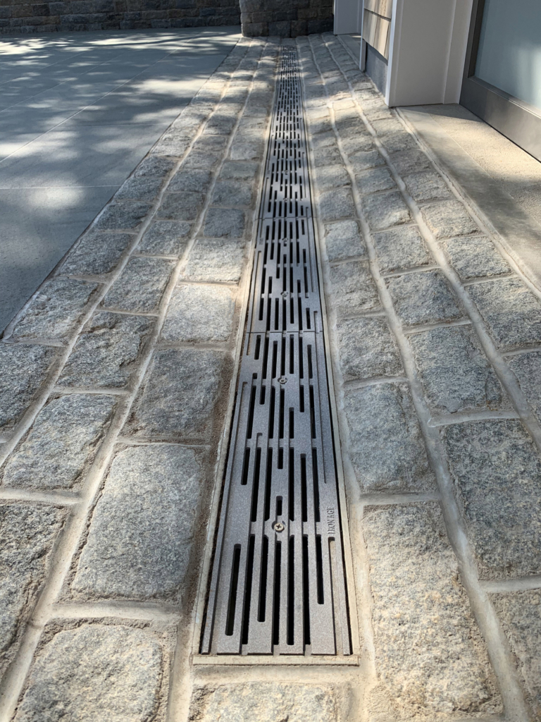 Rain 5″ x 20″ heel-proof trench grate, cast ductile iron with baked-on-oil finish. LOCATION: Seattle, WA.