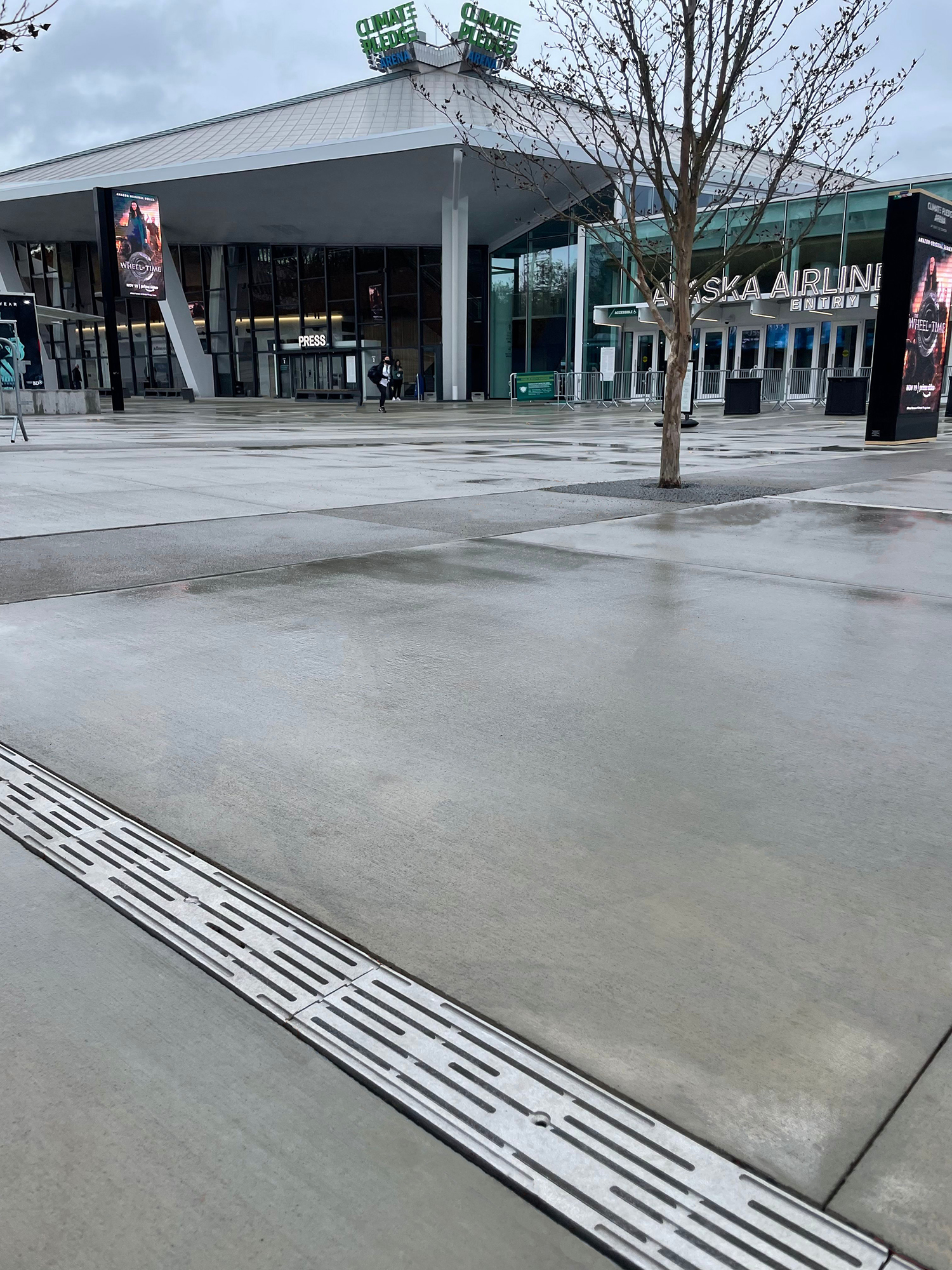 Rain 5″ x 20″ heel-proof trench grate, raw cast aluminum. DESIGN: Swift Company. PROJECT: Climate Pledge Arena. LOCATION: Seattle, WA.
