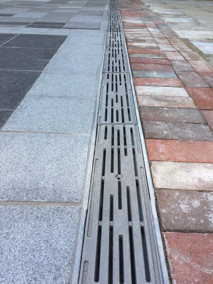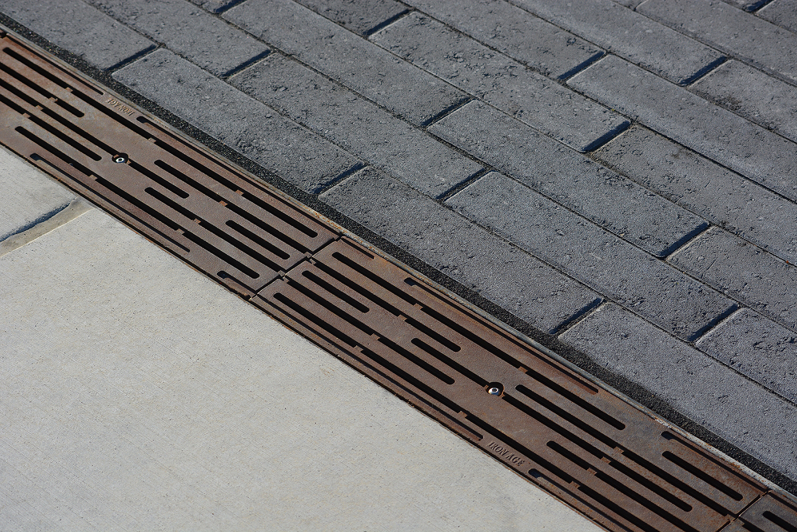 Rain 6″ x 24″ heel-proof trench grate, raw cast ductile iron. DESIGN: McKnight Landscape Architects. INSTALLER: Arkel Constructors.