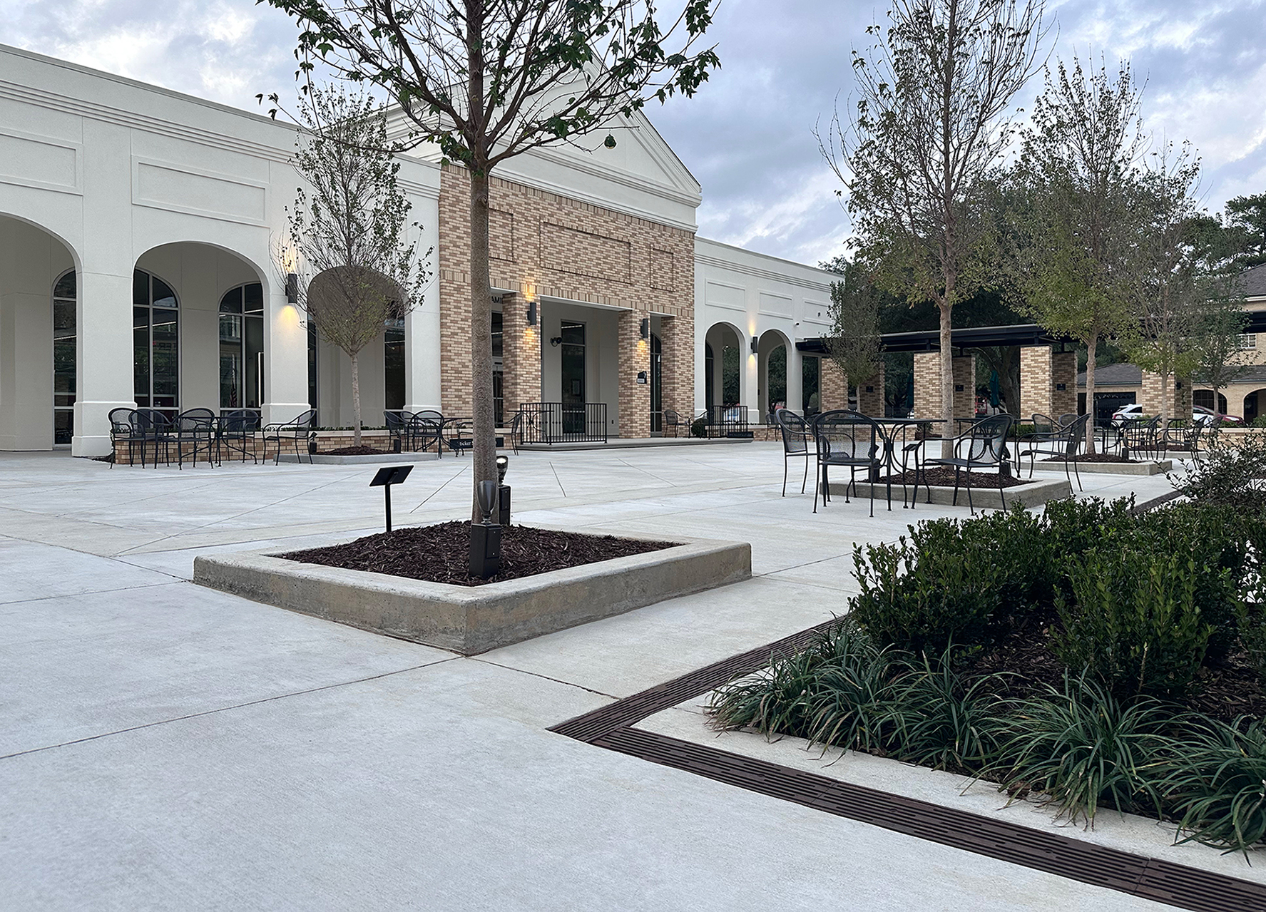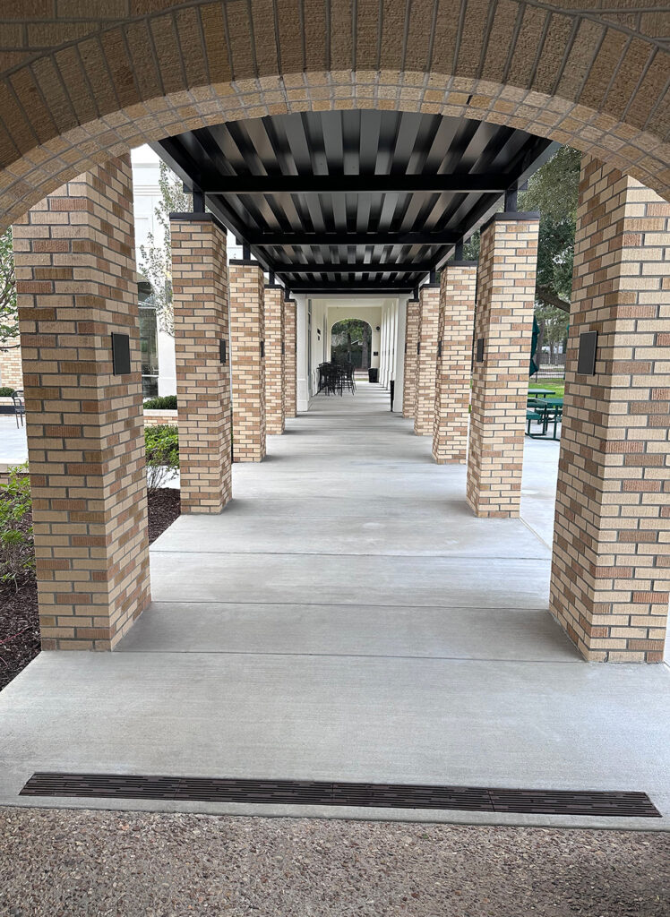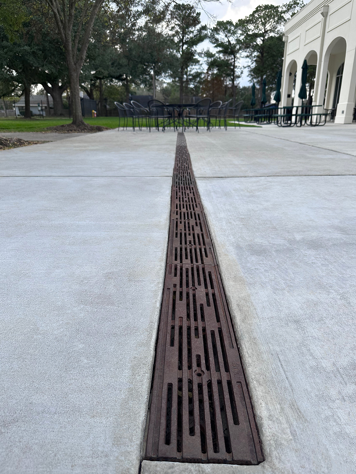 Rain 5″ x 20″ heel proof trench grate, raw cast ductile iron (newly installed, prior to start of oxidation process). DESIGN: Joseph Furr Design Studio. INSTALLATION: The Lemoine Company. PROJECT: Rivermark Center. LOCATION: Baton Rouge, LA.