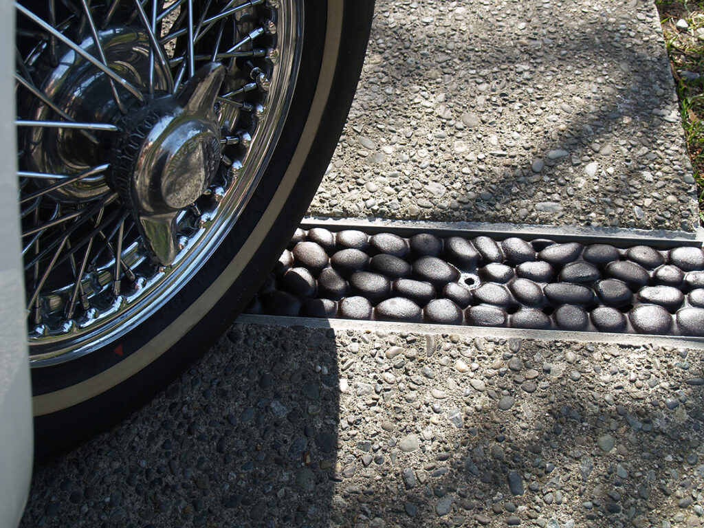 River Rock 5″ x 20″ trench grate, cast ductile iron with baked-on-oil finish. The catch basin array at the far end of the trench was made by cutting two River Rock 8” x 20” grates. PROJECT: Residential driveway. LOCATION: Los Gatos, CA. PHOTO CREDIT: Homeowner Virginia H.