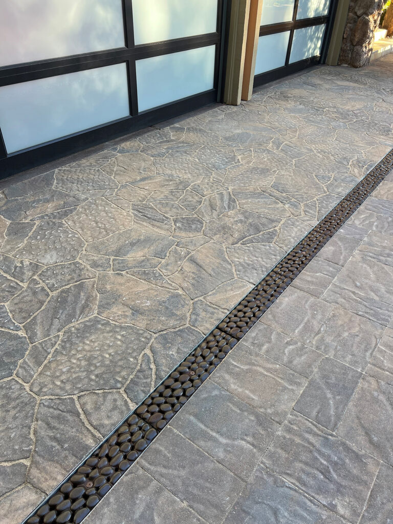 River Rock 5″ x 20″ trench grate, cast ductile iron with baked-on-oil finish. PROJECT: Residential driveway. LOCATION: Los Gatos, CA. PHOTO CREDIT: Homeowner Virginia H.