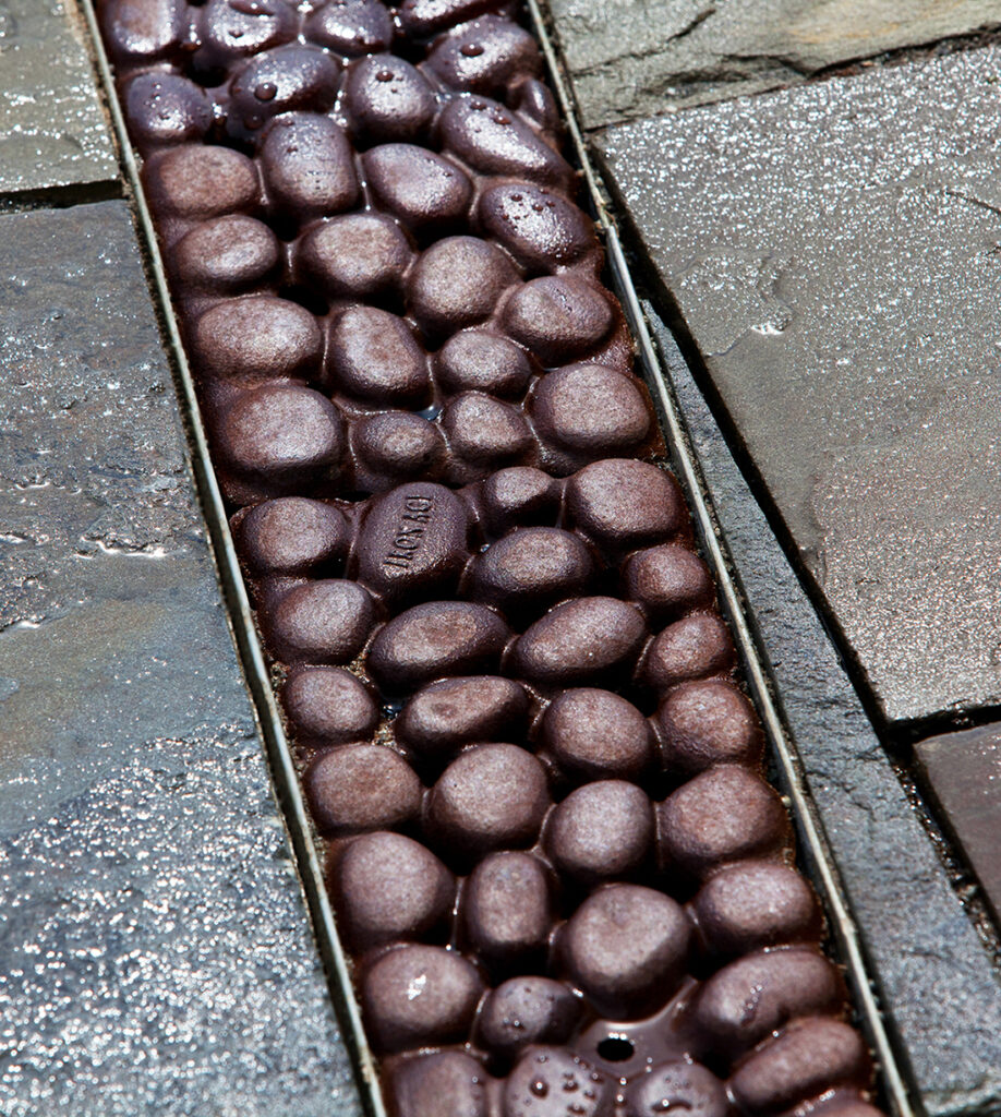 River Rock 5″ x 20″ trench grate, cast iron with baked-on-oil finish. DESIGN: Portico/MIG. PROJECT: KidsQuest Children’s Museum. LOCATION: Bellevue, WA.