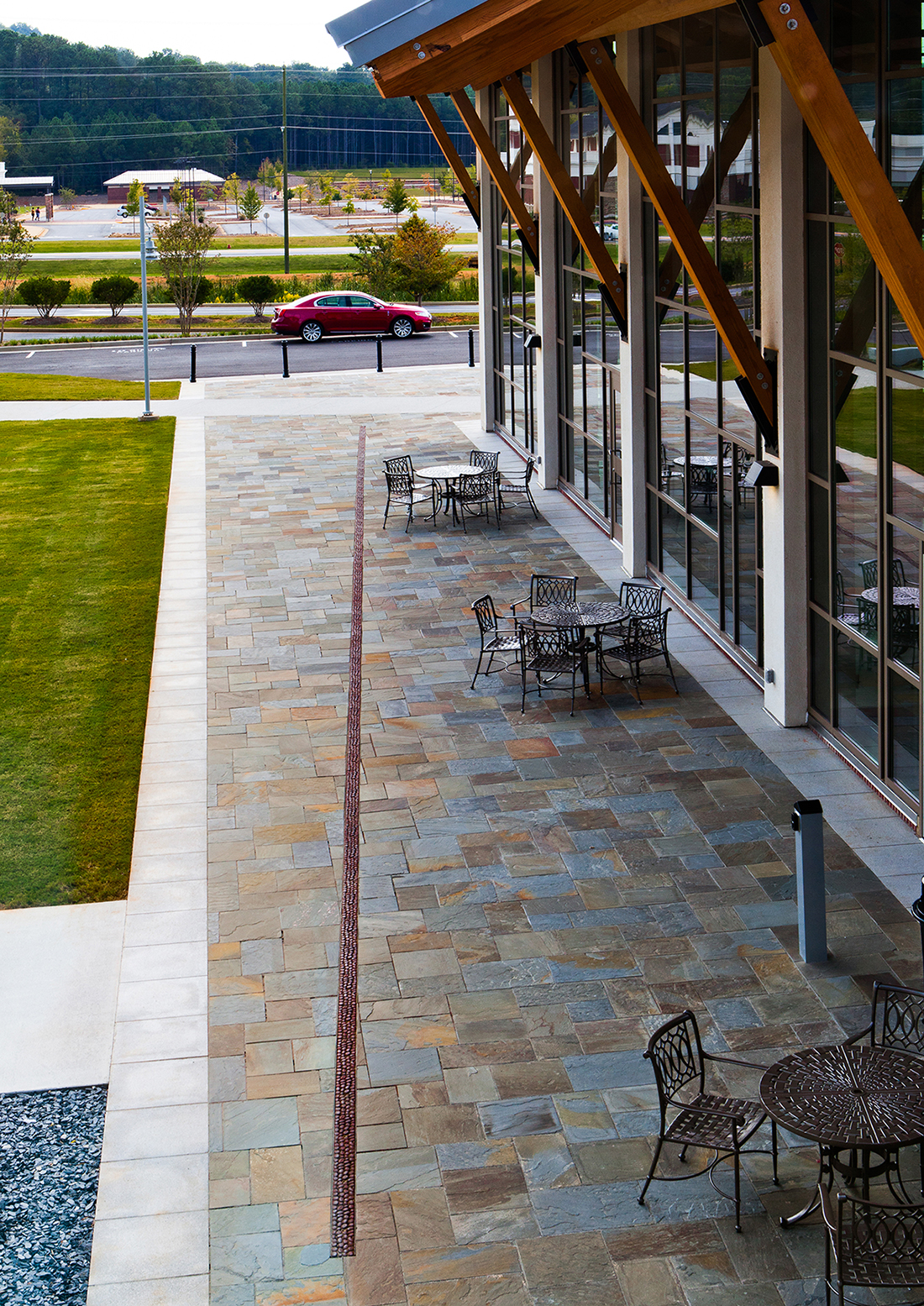 River Rock 5″ x 20″ trench grate, cast ductile iron with baked-on-oil finish. DESIGN: Cooper Carry. PROJECT: Georgia Highlands College, Bartow Center. LOCATION: Rome, GA.