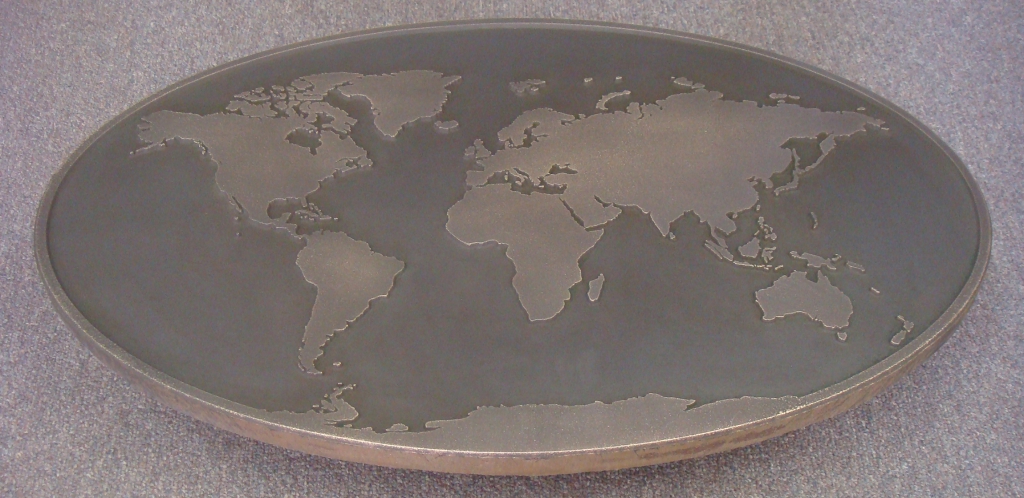 World Map plaque/embed, cast bronze with patina and highlight. PROJECT/LOCATION: Jefferson Park, Tacoma, WA (shown prior to installation).