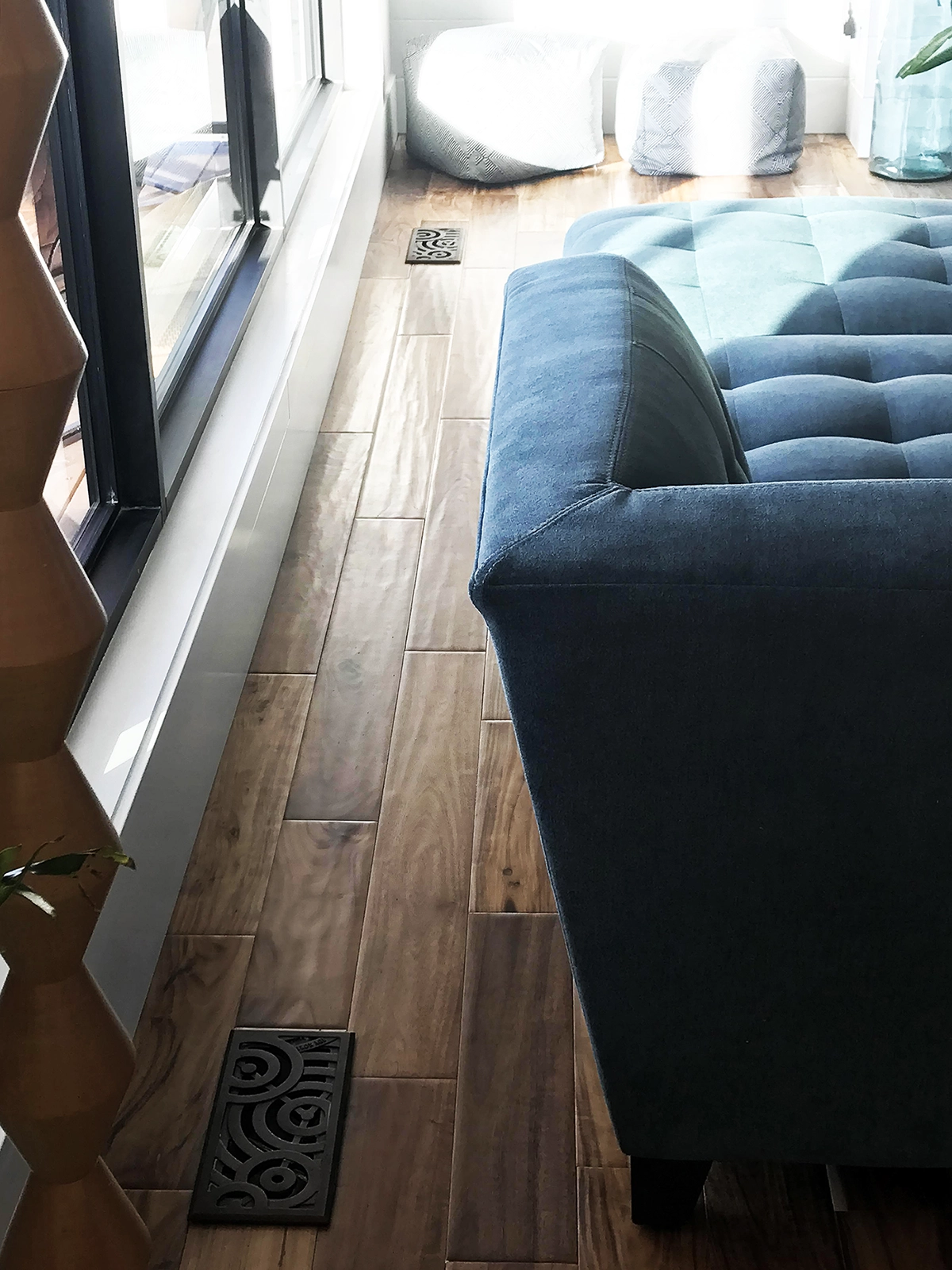 Carbochon 8″ trench grate (bottom photo) re-purposed to replace typical register cover (top photo)
